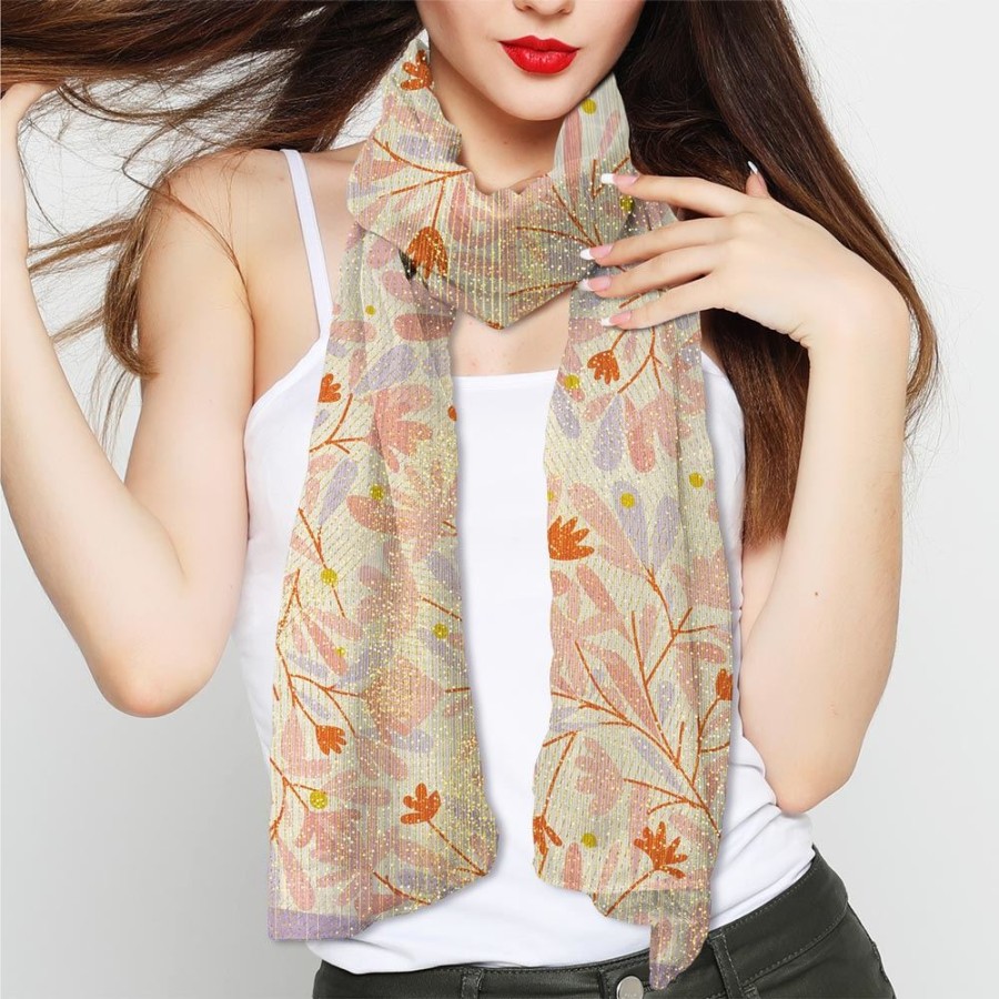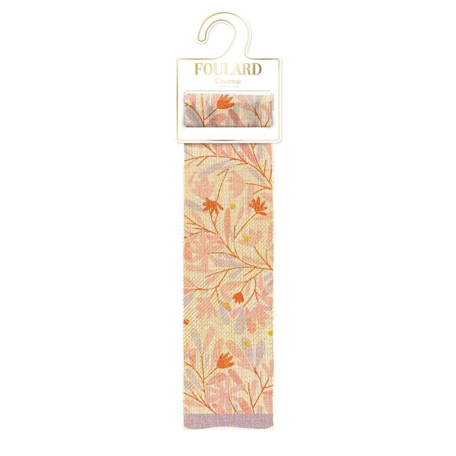 Le foulard est beige avec des tiges et des fleurs colorées. Une fois déplié entièrement, il mesure 90 x 180 cm.