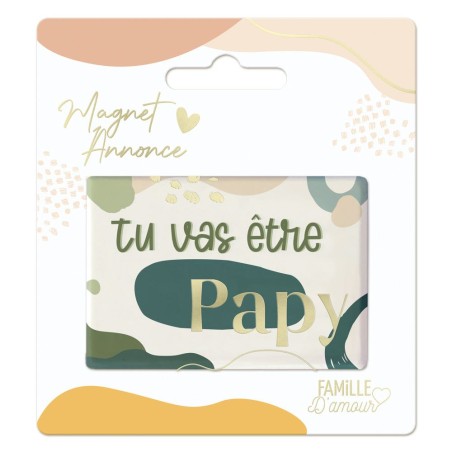 MAGNET ANNONCE "TU VAS ETRE PAPY". Ce magnet "Tu vas être Mamie" est un accessoire déco idéal pour annoncer à votre papa qu'il va être papy. Moment d'émotions garanti ! Pouvant s'accrocher sur le frigo, ce magnet beige se compose de formes abstraites avec la mention "Tu vas être papy" en vert et doré au centre. Dimensions du produit : L. 8,00 cm / l. 0,30 cm / H. 5,50 cm Dimensions du packaging : L. 10,00 cm / H. 11,00 cm