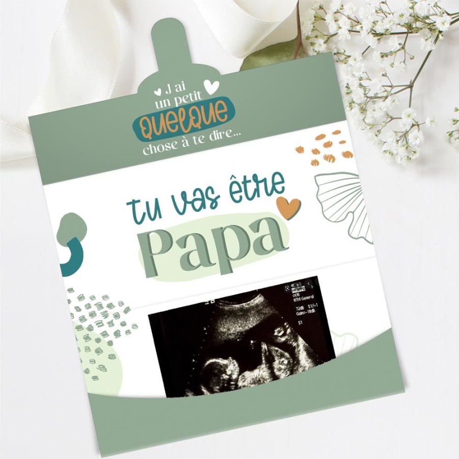 Le produit est une carte enveloppe blanche et verte comportant des motifs originaux qui, lorsqu'elle est dépliée, présente un texte surprise "Tu vas être Papa" et une encoche où vous pourrez joindre une photo.